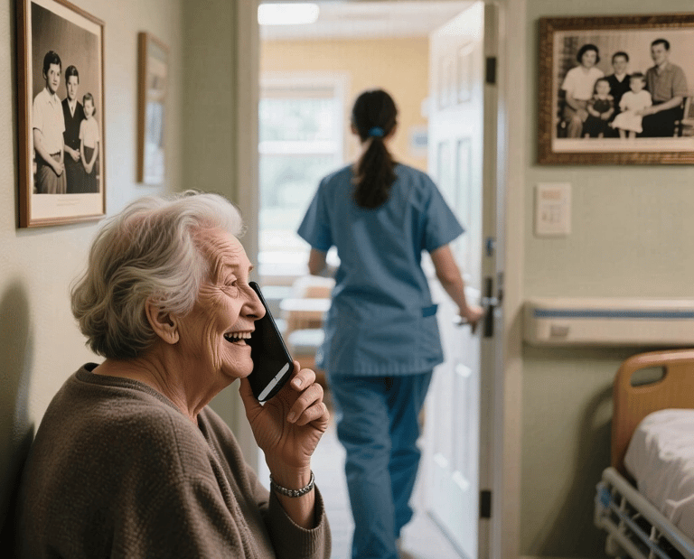 Residents call a dedicated facility phone number and speak with an AI wellness assistant that offers gentle, supportive conversation. The goal is comfort, connection, and emotional well-being — without clinical claims or medical advice.